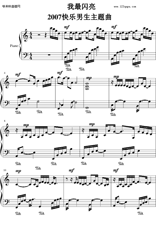 我最闪亮(2007快乐男生主题曲)免费钢琴谱_五线谱:未知 点击: 1000 图片可能经过缩放,手机长按或点开后长按保存,电脑鼠标右键保存.