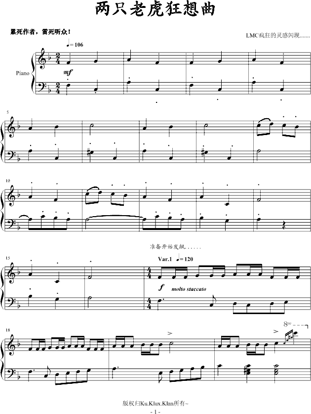 两只老虎狂想曲-钢琴谱(钢琴曲)-Ku.Klux.Klan免费钢琴谱_五线谱: 点击: 1000 图片可能经过缩放,手机长按或点开后长按保存,电脑鼠标右键保存.