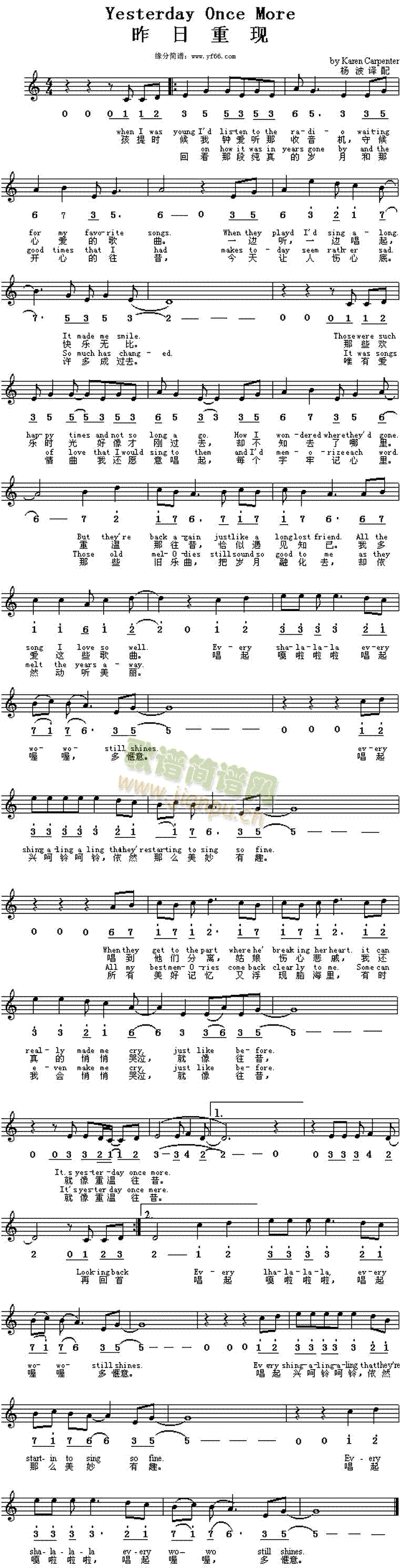Yesterday Once More昨日重现免费钢琴谱_五线谱:Carpenter 点击: 1000 图片可能经过缩放,手机长按或点开后长按保存,电脑鼠标右键保存.