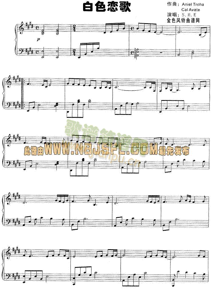 白色恋歌免费钢琴谱_五线谱:S.H.E 点击: 1000 图片可能经过缩放,手机长按或点开后长按保存,电脑鼠标右键保存.
