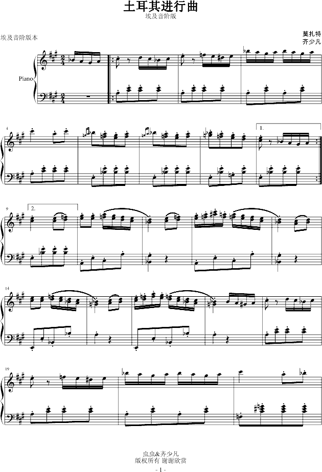 土耳其进行曲(埃及音阶版)-钢琴谱(钢琴曲)-齐少凡免费钢琴谱_五线谱: 点击: 1000 图片可能经过缩放,手机长按或点开后长按保存,电脑鼠标右键保存.