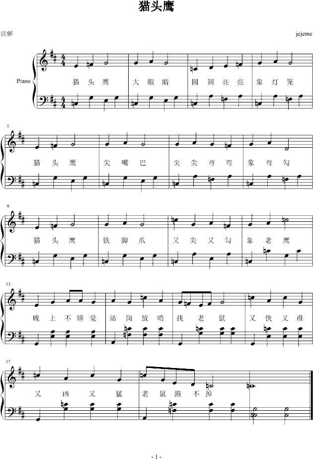 猫头鹰免费钢琴谱_五线谱/词曲:jejemejejeme点击: 1000 图片可能经过缩放,手机长按或点开后长按保存,电脑鼠标右键保存.