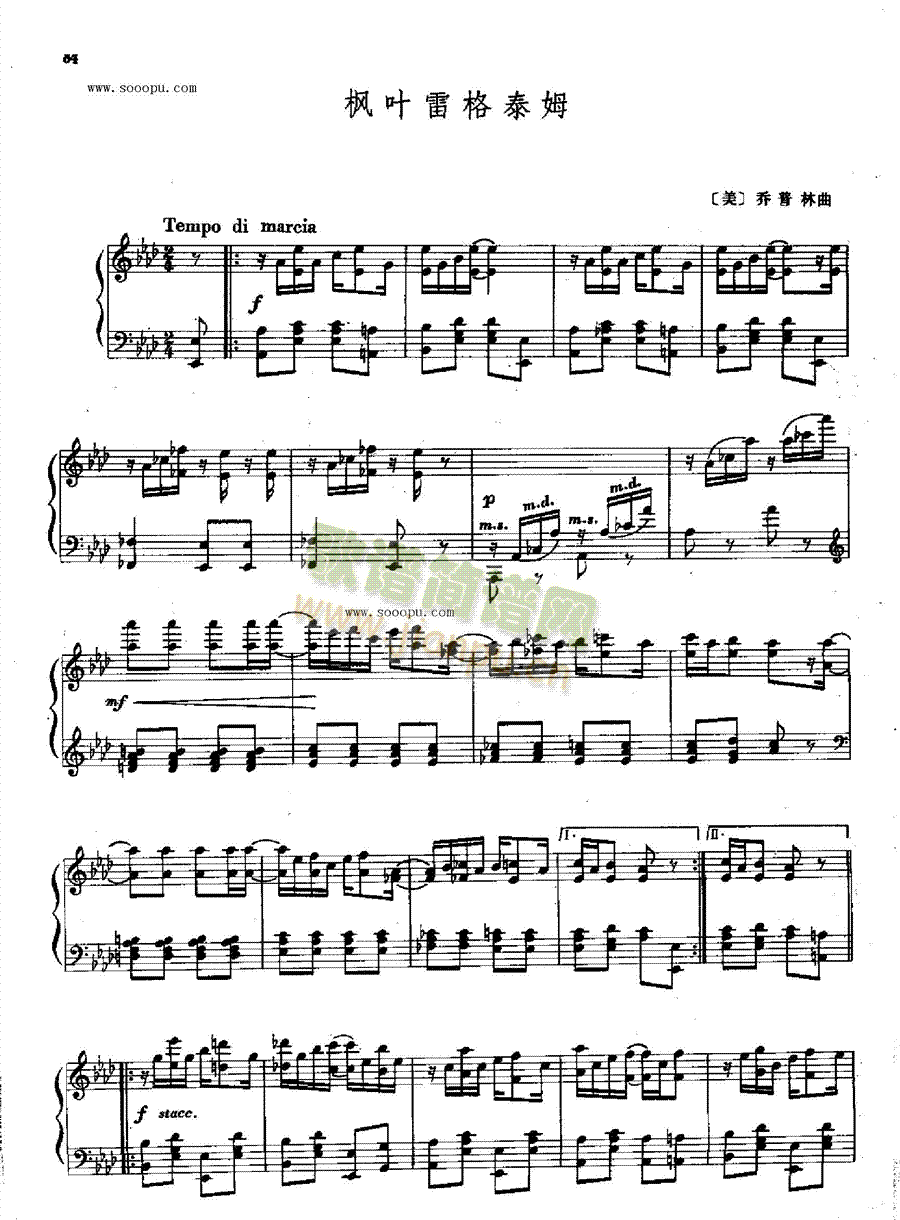 枫叶雷格泰姆 键盘类 钢琴免费钢琴谱_五线谱:[美]乔普林曲 点击: 1000 图片可能经过缩放,手机长按或点开后长按保存,电脑鼠标右键保存.