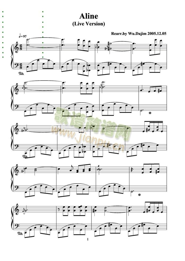 Aline免费钢琴谱_五线谱: 点击: 1000 图片可能经过缩放,手机长按或点开后长按保存,电脑鼠标右键保存.