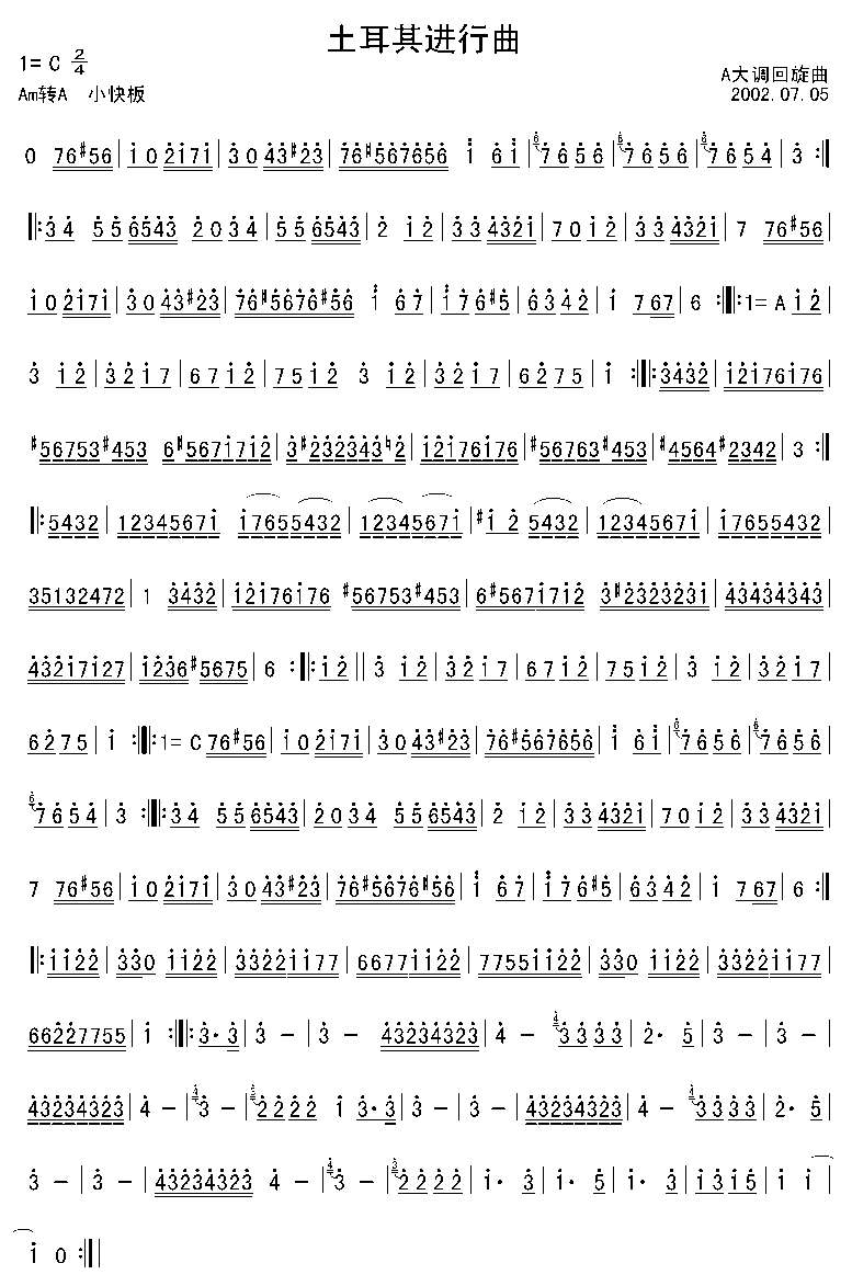 土耳其进行曲钢琴曲 A大调土耳其进行曲免费钢琴谱_五线谱/词曲: A大调土耳其进行点击: 1000 图片可能经过缩放,手机长按或点开后长按保存,电脑鼠标右键保存.