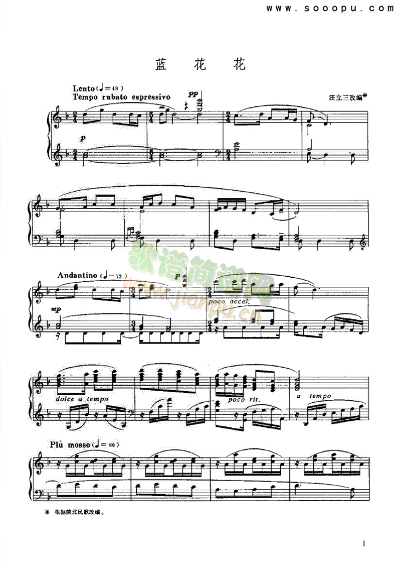 蓝花花 键盘类 钢琴免费钢琴谱_五线谱:汪立三 点击: 1000 图片可能经过缩放,手机长按或点开后长按保存,电脑鼠标右键保存.