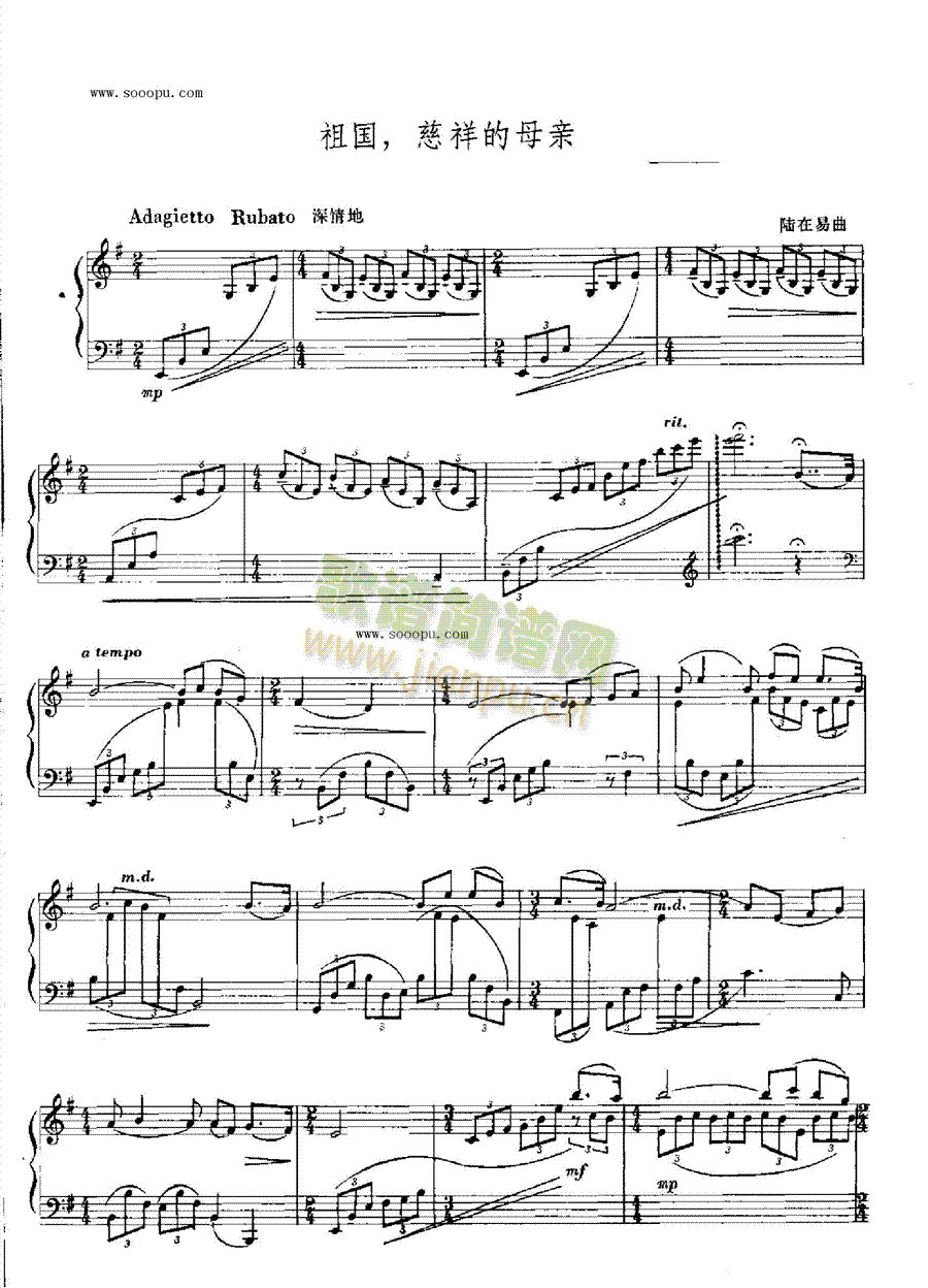 祖国,慈祥的母亲 键盘类 钢琴免费钢琴谱_五线谱:陆在易 点击: 1000 图片可能经过缩放,手机长按或点开后长按保存,电脑鼠标右键保存.