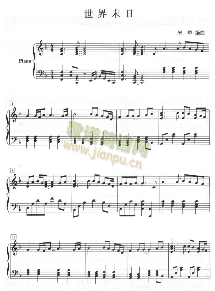 世界末日 (钢琴五线谱)[演奏版]免费钢琴谱_五线谱:周杰伦 点击: 1000 图片可能经过缩放,手机长按或点开后长按保存,电脑鼠标右键保存.