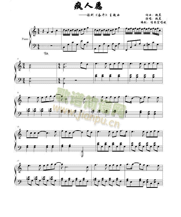 疯人愿免费钢琴谱_五线谱:魏晨 点击: 1000 图片可能经过缩放,手机长按或点开后长按保存,电脑鼠标右键保存.