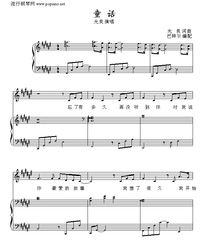 童话-巴特尔版免费钢琴谱_五线谱:光良 点击: 1000 图片可能经过缩放,手机长按或点开后长按保存,电脑鼠标右键保存.
