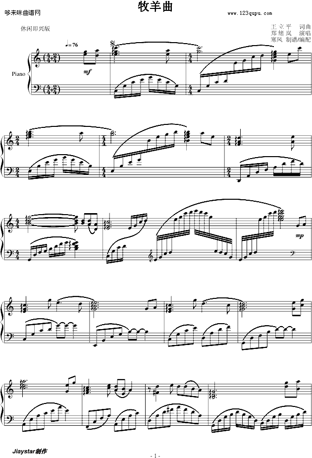 牧羊曲-休闲即兴版-王立平免费钢琴谱_五线谱:未知 点击: 1000 图片可能经过缩放,手机长按或点开后长按保存,电脑鼠标右键保存.