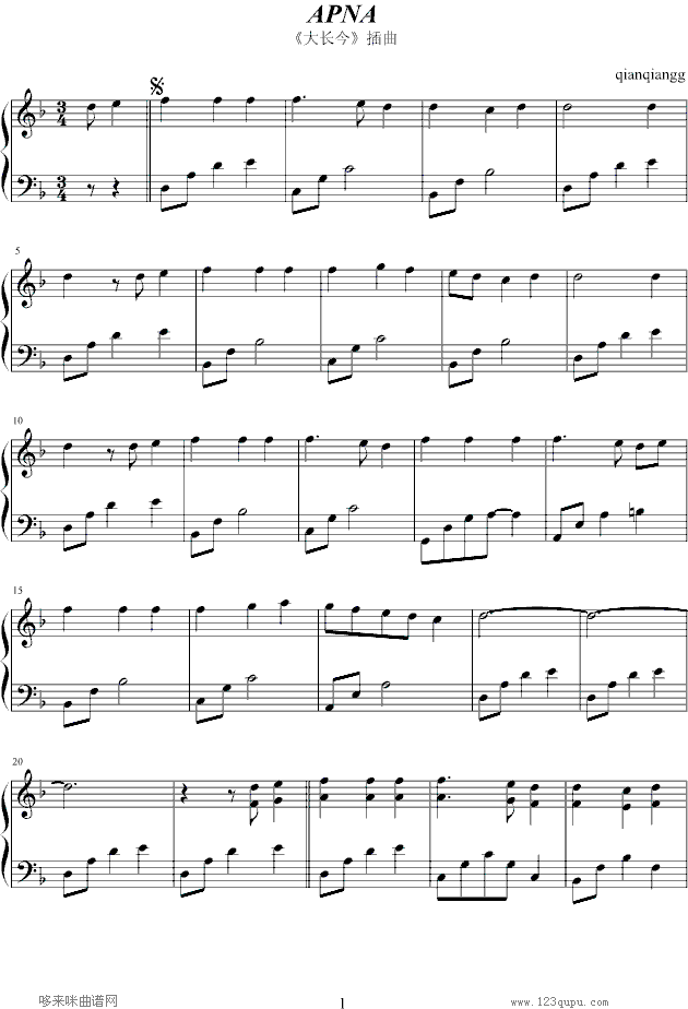 APNA-大长今 插曲-大长今免费钢琴谱_五线谱:未知 点击: 1000 图片可能经过缩放,手机长按或点开后长按保存,电脑鼠标右键保存.