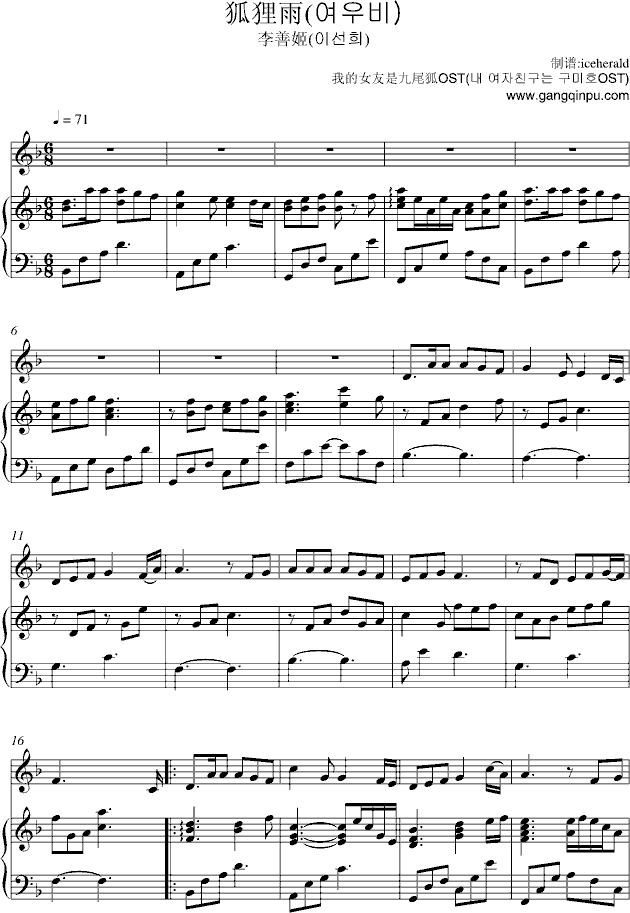 狐狸雨(我的女友是九尾狐OST)-钢琴谱(钢琴曲)-李善姬免费钢琴谱_五线谱: 点击: 1000 图片可能经过缩放,手机长按或点开后长按保存,电脑鼠标右键保存.