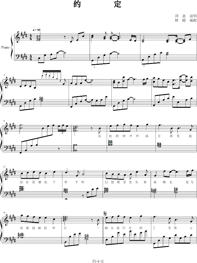 约定-舞蝶版免费钢琴谱_五线谱:周惠 点击: 1000 图片可能经过缩放,手机长按或点开后长按保存,电脑鼠标右键保存.