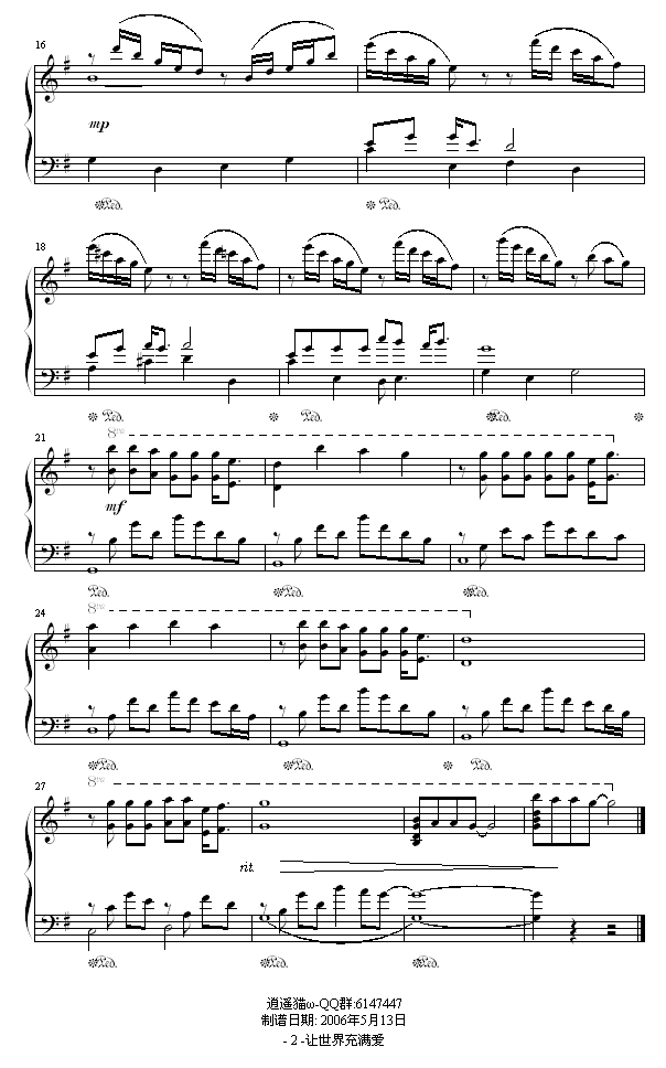 让世界充满爱-独奏免费钢琴谱_五线谱:郭峰 点击: 1000 图片可能经过缩放,手机长按或点开后长按保存,电脑鼠标右键保存.