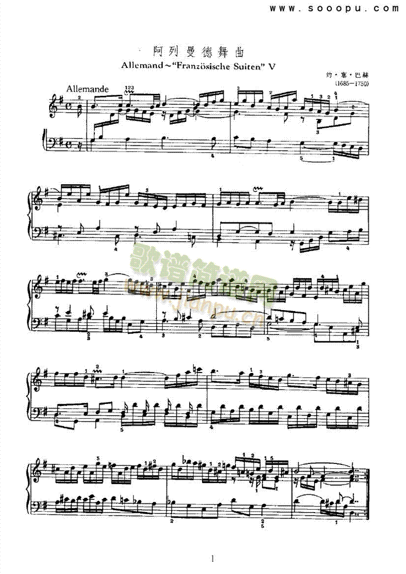 阿列曼德舞曲 键盘类 钢琴免费钢琴谱_五线谱:巴赫 点击: 1000 图片可能经过缩放,手机长按或点开后长按保存,电脑鼠标右键保存.