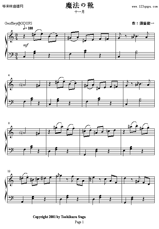 十一月魔法之靴-须釜俊一免费钢琴谱_五线谱:未知 点击: 1000 图片可能经过缩放,手机长按或点开后长按保存,电脑鼠标右键保存.