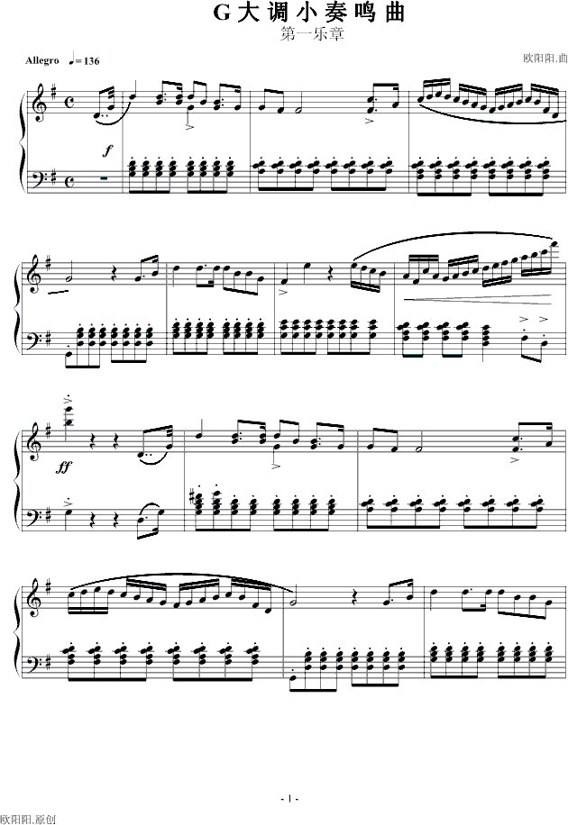 G大调小奏鸣曲第一乐章No.1免费钢琴谱_五线谱:欧阳阳. 点击: 1000 图片可能经过缩放,手机长按或点开后长按保存,电脑鼠标右键保存.