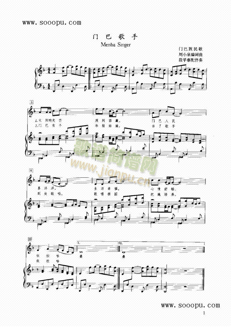 门巴歌手 键盘类 钢琴免费钢琴谱_五线谱:民歌 点击: 1000 图片可能经过缩放,手机长按或点开后长按保存,电脑鼠标右键保存.