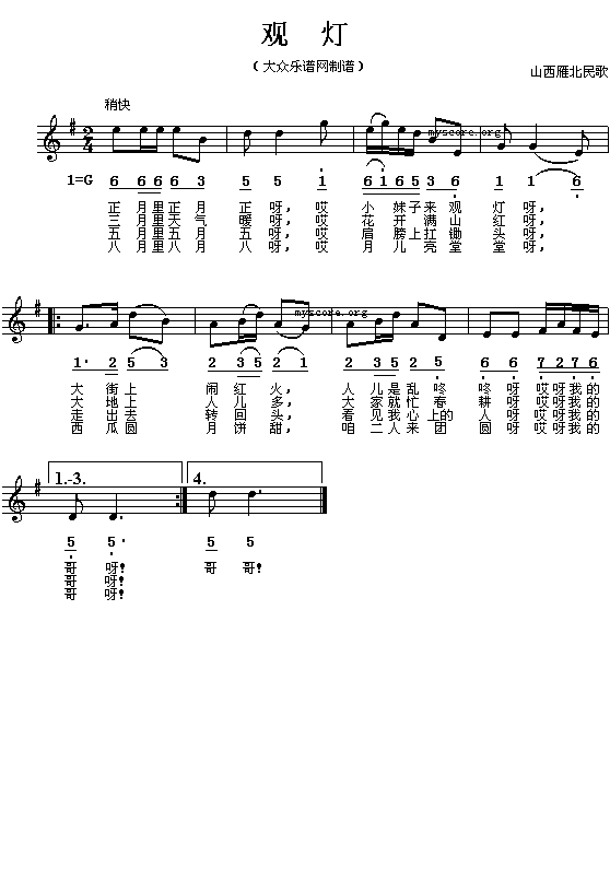 山西民歌:观灯(简线对照)免费钢琴谱_五线谱:未知 点击: 1000 图片可能经过缩放,手机长按或点开后长按保存,电脑鼠标右键保存.