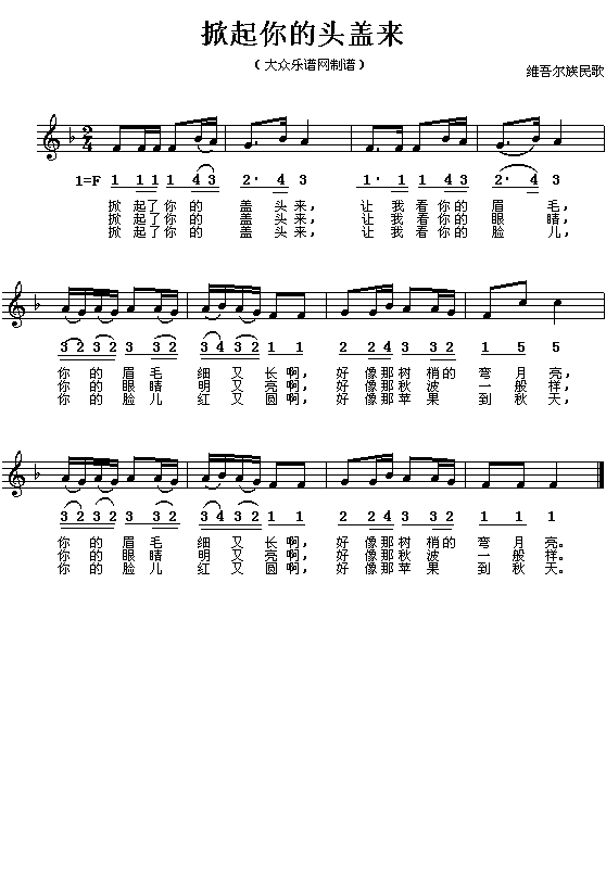 维吾尔族民歌:掀起你的盖头来(简线对照)免费钢琴谱_五线谱:未知 点击: 1000 图片可能经过缩放,手机长按或点开后长按保存,电脑鼠标右键保存.