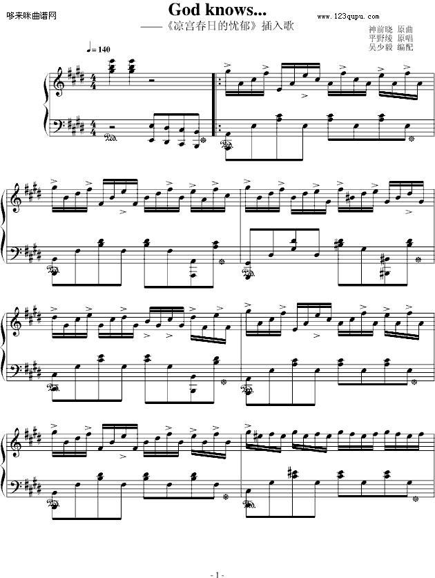 God Know-动漫影视免费钢琴谱_五线谱:未知 点击: 1000 图片可能经过缩放,手机长按或点开后长按保存,电脑鼠标右键保存.