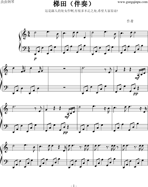 梯田(钢琴伴奏)-钢琴谱(钢琴曲)-周杰伦免费钢琴谱_五线谱: 点击: 1000 图片可能经过缩放,手机长按或点开后长按保存,电脑鼠标右键保存.