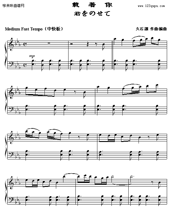 载着你-久石让免费钢琴谱_五线谱:未知 点击: 1000 图片可能经过缩放,手机长按或点开后长按保存,电脑鼠标右键保存.