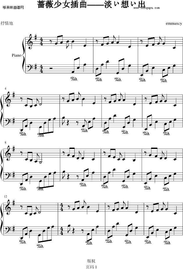 蔷薇少女插曲——淡い想い出-动漫影视免费钢琴谱_五线谱:未知 点击: 1000 图片可能经过缩放,手机长按或点开后长按保存,电脑鼠标右键保存.