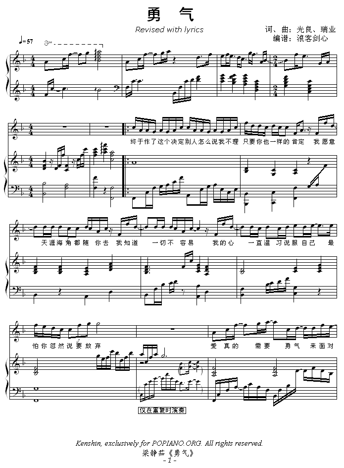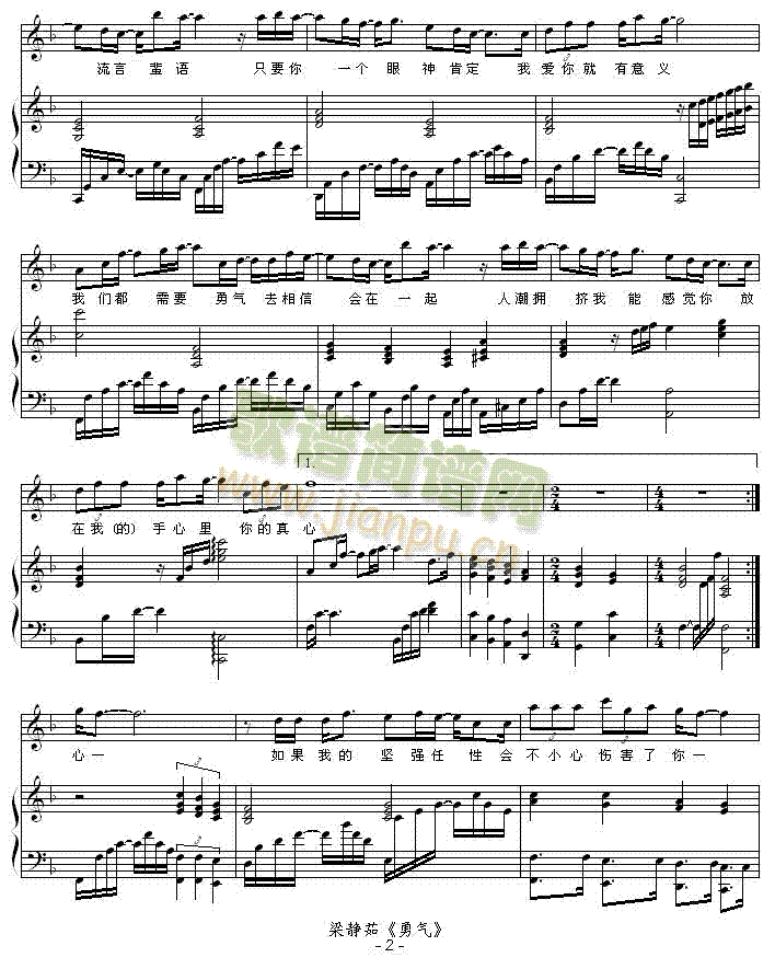 勇气 -(弹唱版)免费钢琴谱_五线谱:梁静茹 点击: 1000 图片可能经过缩放,手机长按或点开后长按保存,电脑鼠标右键保存.