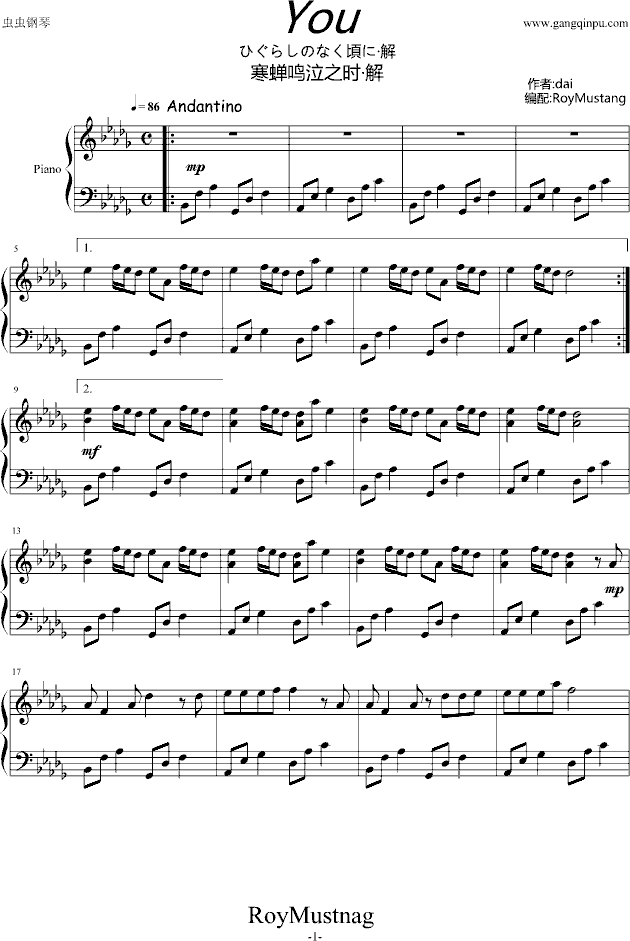 You [寒蝉鸣泣之时]-钢琴谱(钢琴曲)-动漫影视免费钢琴谱_五线谱: 点击: 1000 图片可能经过缩放,手机长按或点开后长按保存,电脑鼠标右键保存.