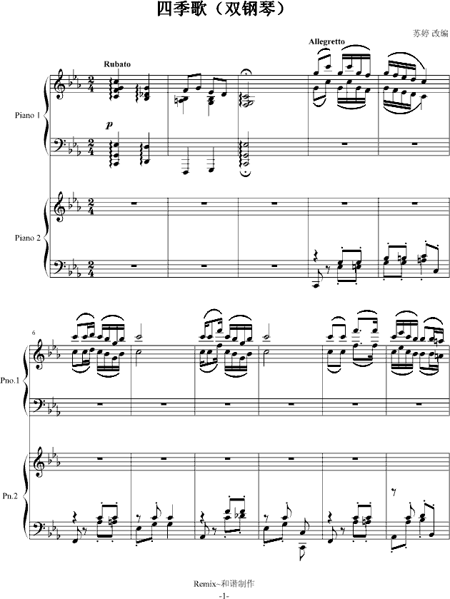 四季歌(双钢琴)-钢琴谱(钢琴曲)-苏婷免费钢琴谱_五线谱: 点击: 1000 图片可能经过缩放,手机长按或点开后长按保存,电脑鼠标右键保存.