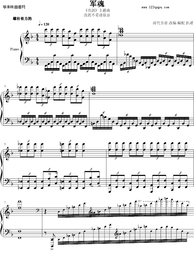 军魂—《亮剑》主题曲-影视免费钢琴谱_五线谱:未知 点击: 1000 图片可能经过缩放,手机长按或点开后长按保存,电脑鼠标右键保存.