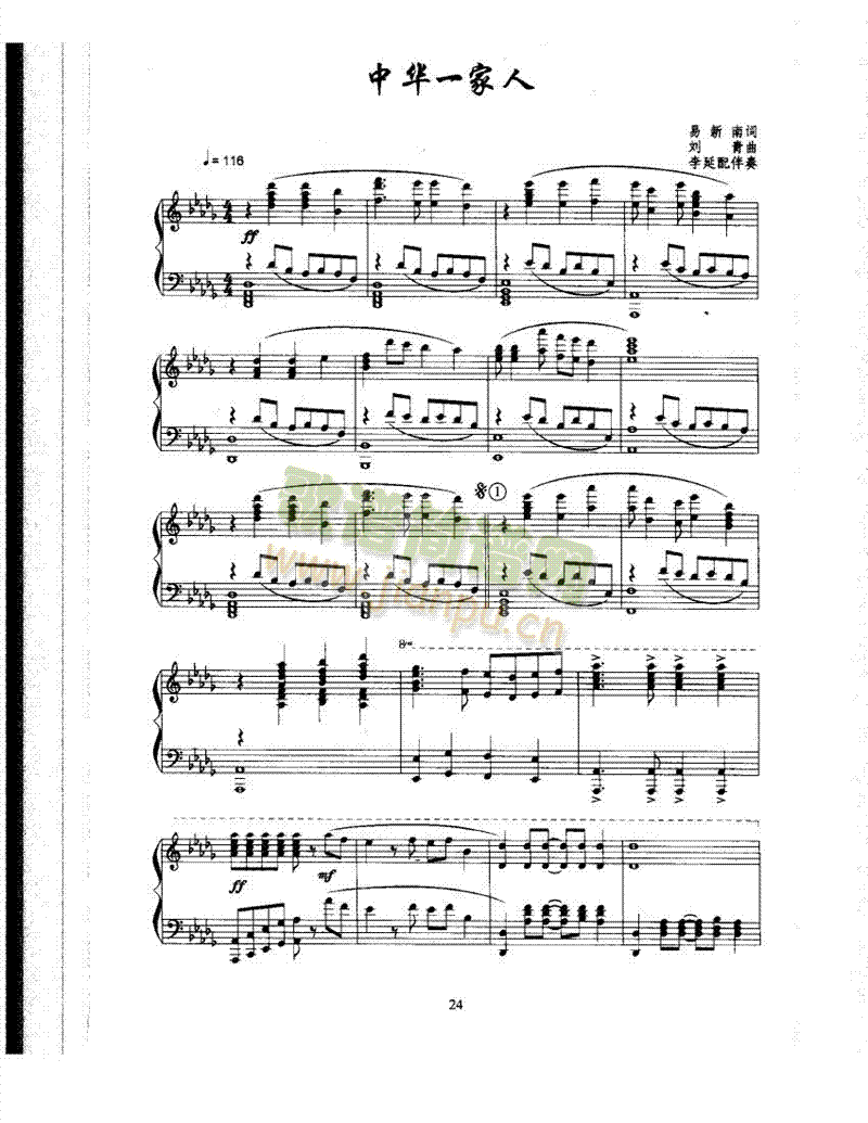 中华一家人 歌曲类 钢琴伴奏谱免费钢琴谱_五线谱:刘青 点击: 1000 图片可能经过缩放,手机长按或点开后长按保存,电脑鼠标右键保存.