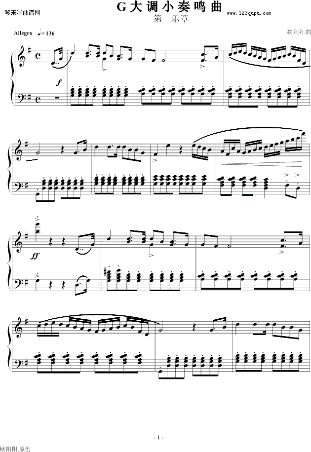 G大调小奏鸣曲第一乐章No.1-欧阳阳.免费钢琴谱_五线谱:未知 点击: 1000 图片可能经过缩放,手机长按或点开后长按保存,电脑鼠标右键保存.