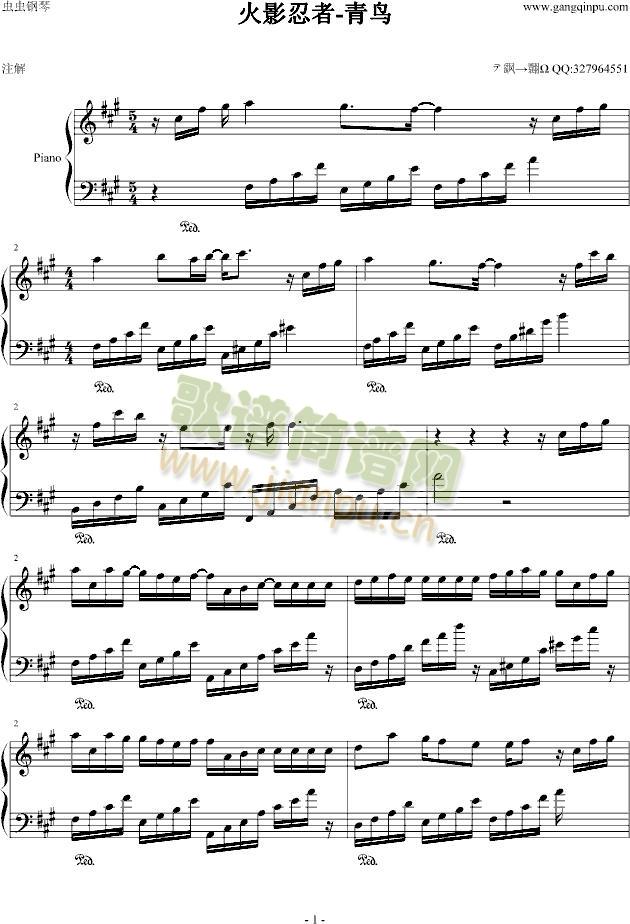 火影忍者-青鸟免费钢琴谱_五线谱:火影忍者 点击: 1000 图片可能经过缩放,手机长按或点开后长按保存,电脑鼠标右键保存.