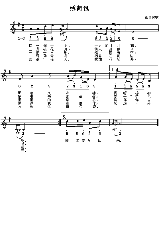 山西民歌:绣荷包(简线对照)免费钢琴谱_五线谱:未知 点击: 1000 图片可能经过缩放,手机长按或点开后长按保存,电脑鼠标右键保存.