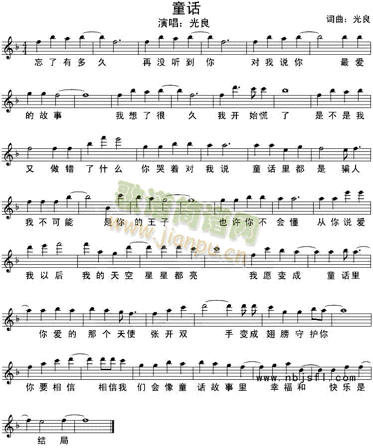 童话(五线谱)免费钢琴谱_五线谱:光良 点击: 1000 图片可能经过缩放,手机长按或点开后长按保存,电脑鼠标右键保存.