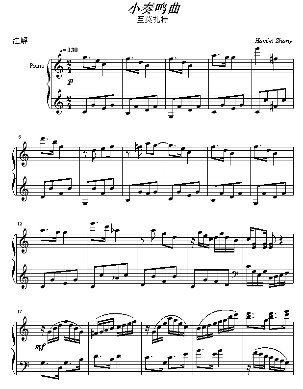 小奏鸣曲.至莫扎特免费钢琴谱_五线谱:Hamlet 点击: 1000 图片可能经过缩放,手机长按或点开后长按保存,电脑鼠标右键保存.