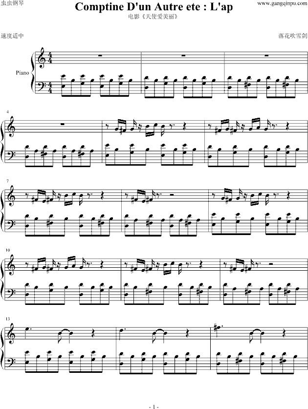 Comptine Dun Autre ete(天使爱美丽)-钢琴谱(钢琴曲)-影视免费钢琴谱_五线谱: 点击: 1000 图片可能经过缩放,手机长按或点开后长按保存,电脑鼠标右键保存.