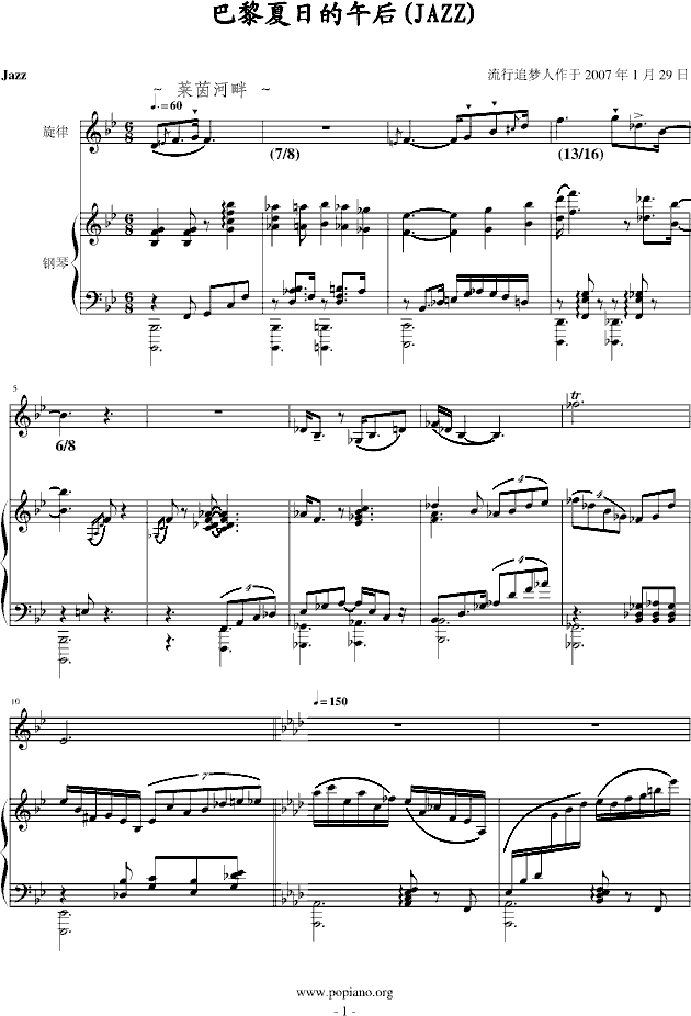 爵士乐《巴黎夏日的午后》免费钢琴谱_五线谱:追梦人 点击: 1000 图片可能经过缩放,手机长按或点开后长按保存,电脑鼠标右键保存.