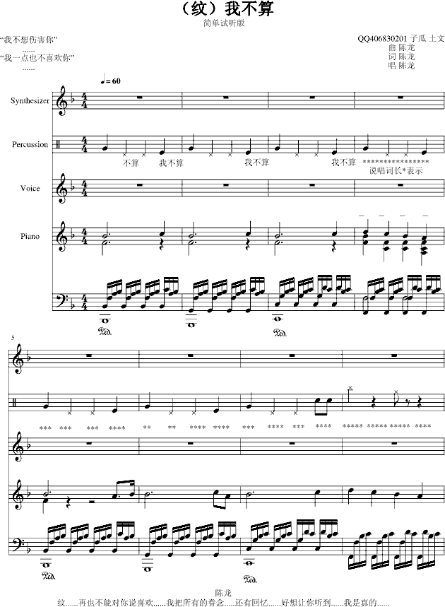 我不算免费钢琴谱_五线谱/词曲:陈龙听香点击: 1000 图片可能经过缩放,手机长按或点开后长按保存,电脑鼠标右键保存.