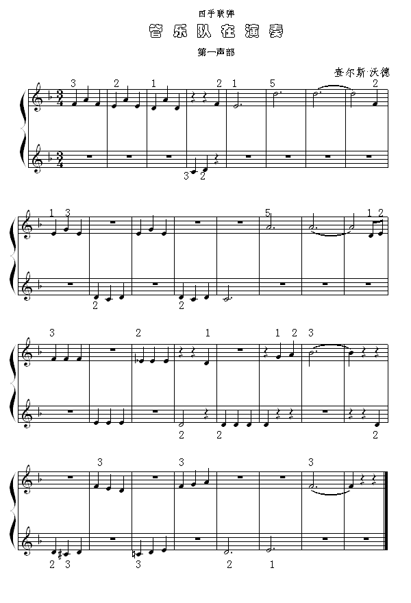 管乐队在演奏(四手联弹第一声部)免费钢琴谱_五线谱:未知 点击: 1000 图片可能经过缩放,手机长按或点开后长按保存,电脑鼠标右键保存.