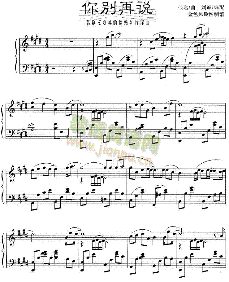 你别再说(韩剧《夏娃的诱惑》片尾曲)免费钢琴谱_五线谱: 点击: 1000 图片可能经过缩放,手机长按或点开后长按保存,电脑鼠标右键保存.