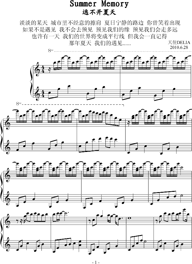 逃不开夏天 Summer Memory-钢琴谱(钢琴曲)-天使DELIA免费钢琴谱_五线谱: 点击: 1000 图片可能经过缩放,手机长按或点开后长按保存,电脑鼠标右键保存.