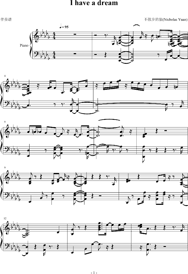 I have a dream 伴奏谱-钢琴谱(钢琴曲)-不散步的狼免费钢琴谱_五线谱: 点击: 1000 图片可能经过缩放,手机长按或点开后长按保存,电脑鼠标右键保存.