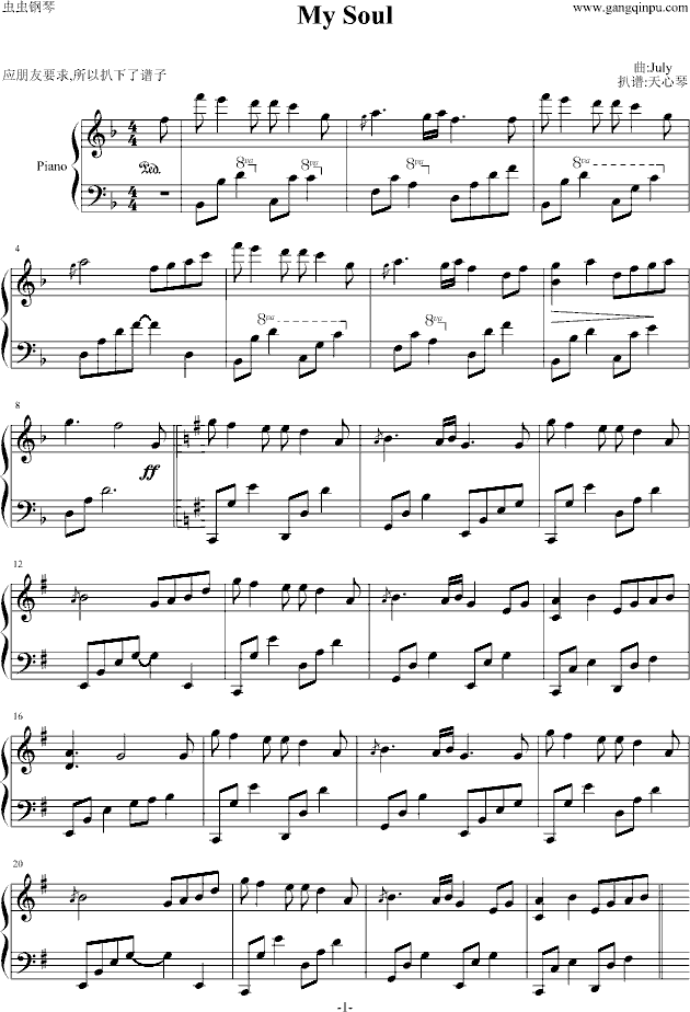My Soul-钢琴谱(钢琴曲)-July免费钢琴谱_五线谱: 点击: 1000 图片可能经过缩放,手机长按或点开后长按保存,电脑鼠标右键保存.