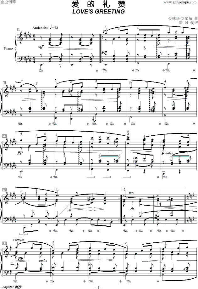 爱的礼赞-寒风免费钢琴谱_五线谱:爱德华·艾尔加 点击: 1000 图片可能经过缩放,手机长按或点开后长按保存,电脑鼠标右键保存.