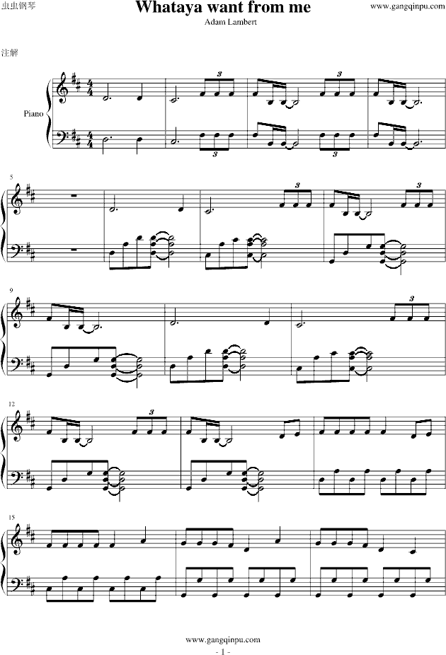 whataya want from me-钢琴谱(钢琴曲)-Adam Lambert免费钢琴谱_五线谱: 点击: 1000 图片可能经过缩放,手机长按或点开后长按保存,电脑鼠标右键保存.