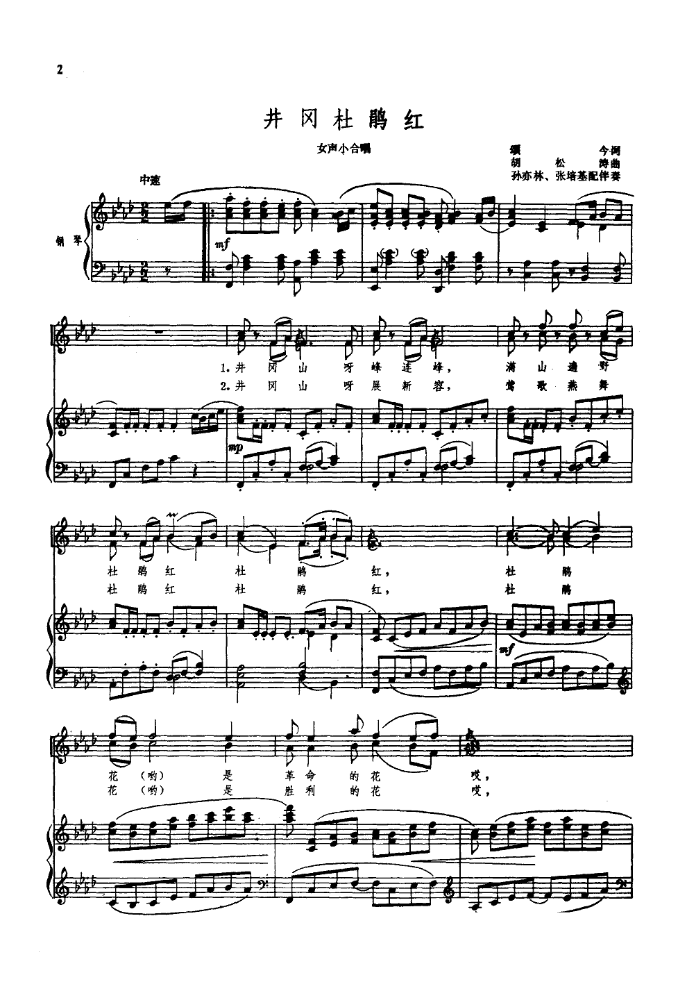 井冈杜鹃红(钢伴谱)免费钢琴谱_五线谱:江西歌舞团 点击: 1000 图片可能经过缩放,手机长按或点开后长按保存,电脑鼠标右键保存.